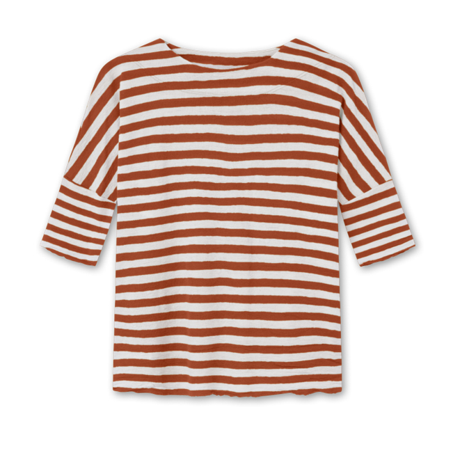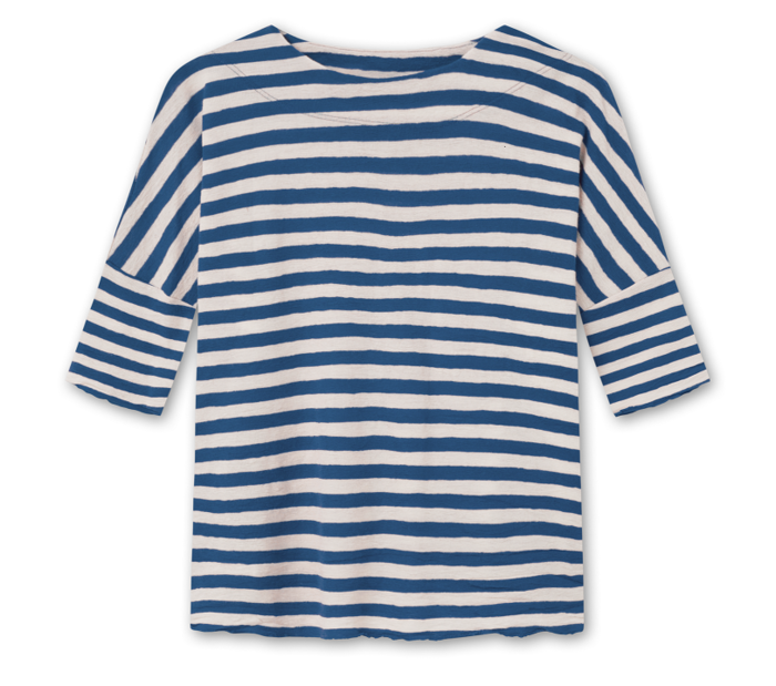 Bluse i blød merinould, med et vidt snit, smuk bådudskæring, og korte ærmer.