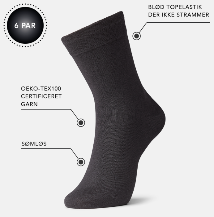 De andre størrelser er uden vævninger under foden - helt sorte - de er pakket med 6 par i en pose.