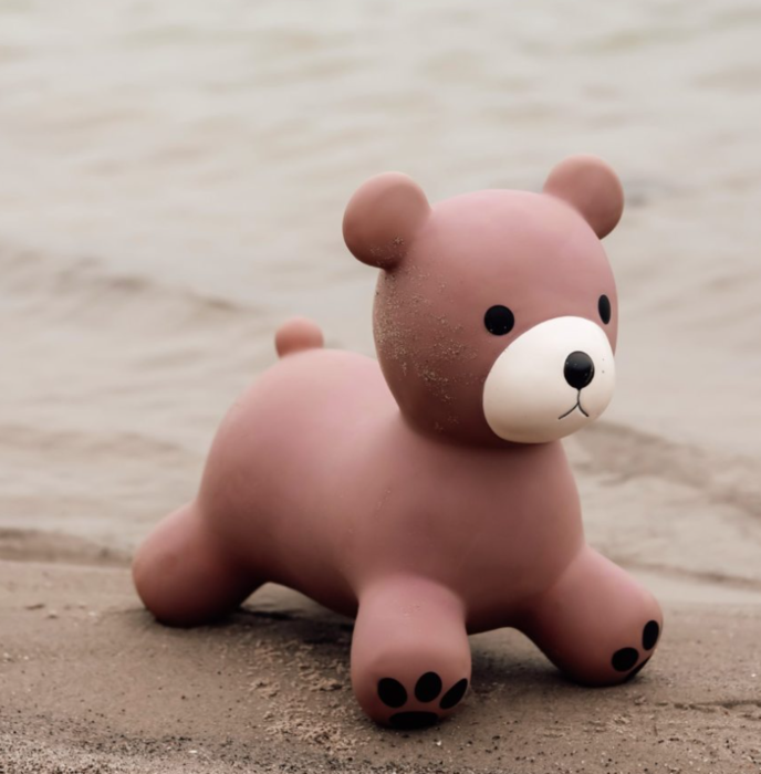 Bjørnen Maya er i en mørkerosa farve med sorte tegninger på og en cremefarvet mule.