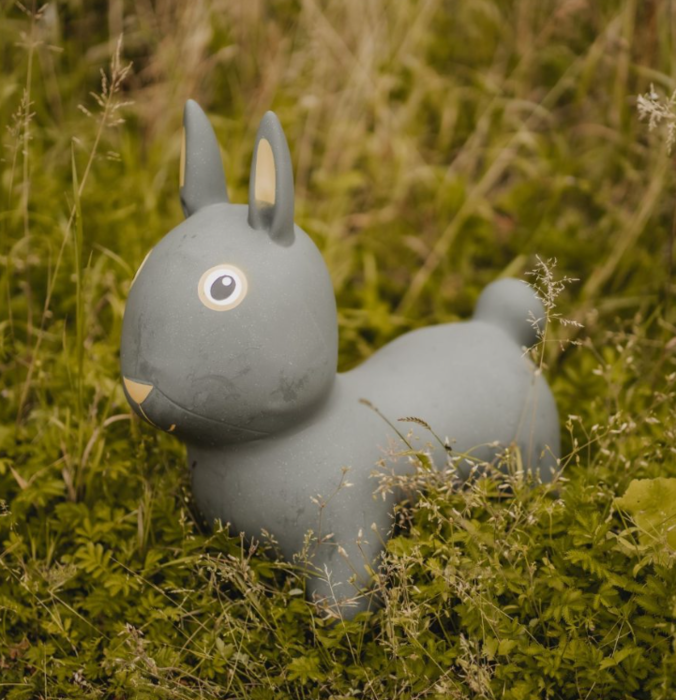 Kaninen Thumper, er i en antracitgrå farve med hvide, varme gule og sorte tegninger på.