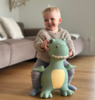 Dinosaurussen Dexter, er i en støvet grøn farve med lysegule, hvide og antracitgrå tegninger på.