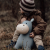 Enhjørningen Luna, er i en sart rosa farve med varme- og antracitgrå tegninger på