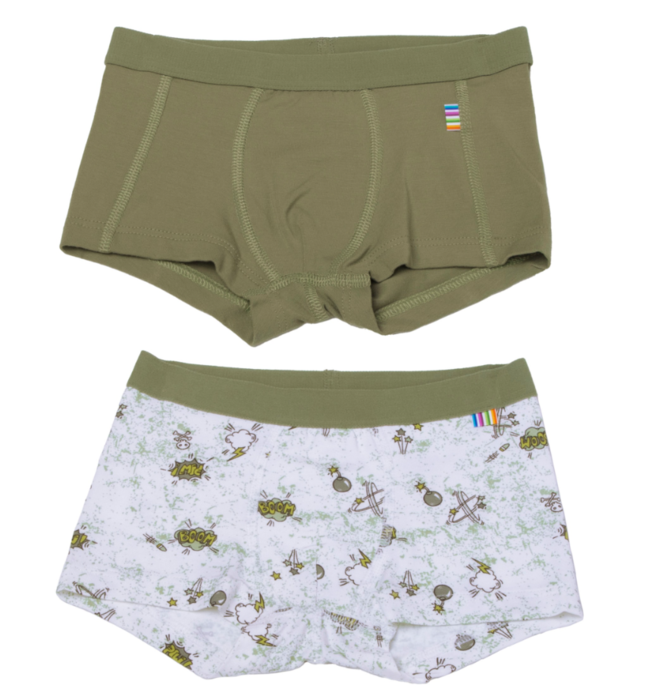 Her får du 2 par - et par i armygrøn, og et par med motiver.